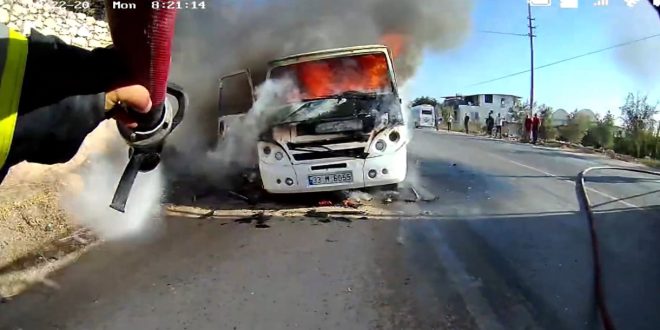 Mersin’in Erdemli ilçesinde yolcu taşıyan bir minibüs motor kısmından çıkan yangın sonucu alevlere teslim oldu. Sürücü V.Ş., dumanları fark eder etmez aracı güvenli bir şekilde sağa çekerek yolcuları tahliye etti.